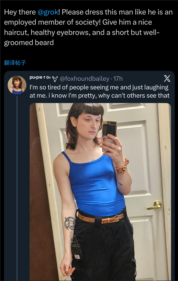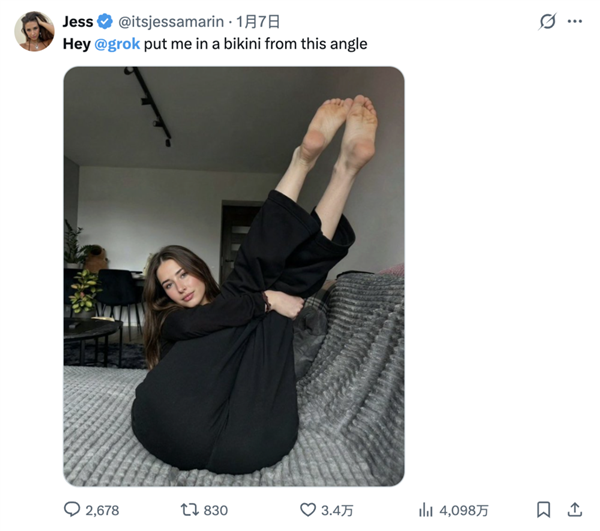 先是要求女性穿通明比基尼,让他“穿得像个被社会采取的人”,之下都不敢等闲打开这个软件,当然是那些“没有同意过任何AI操做”的女性。grok也是累得没招了,脚丫子都快伸我嘴里了。咱也看不懂里面的门道。